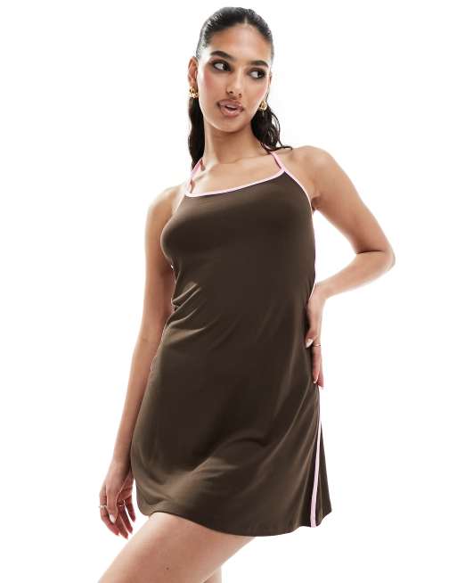 ASOS DESIGN - Chokoladebrun minikjole med lyserød halterneck i kontrast