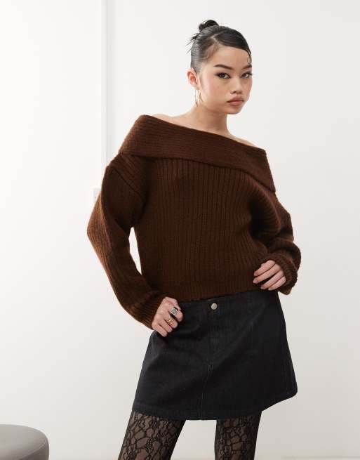 ASOS DESIGN - Chokoladebrun og oversized striktrøje med offshoulder