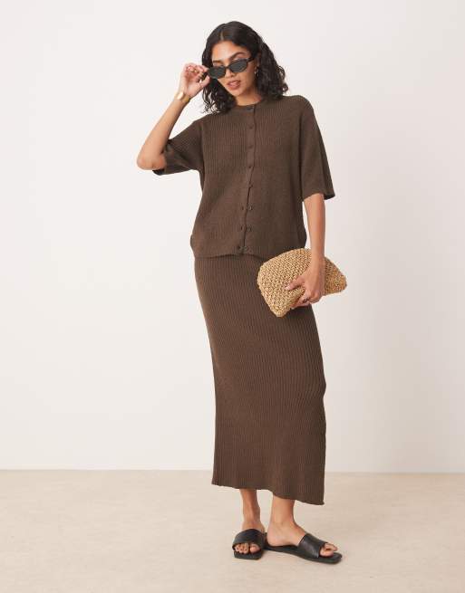 ASOS DESIGN - Chokoladebrunt sæt i boucléstrik med kortærmet cardigan og midaxinederdel