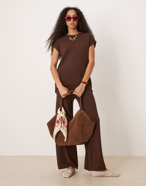 ASOS DESIGN - Chokoladebrunt strikket sæt med T-shirt og bukser med nistret tekstur