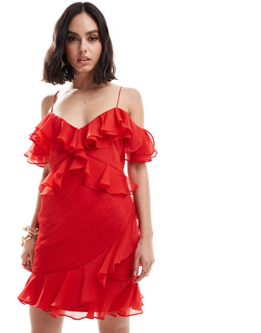 ASOS DESIGN - Cold shoulder-minikjole med flæser i rød