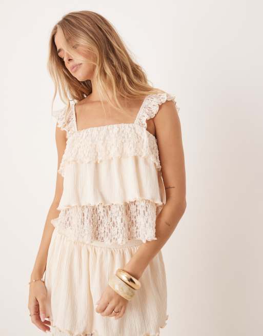 ASOS DESIGN - Cremefarvet camisol med flæser og blondedetaljer