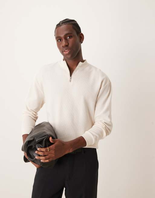 ASOS DESIGN - Cremehvid afslappet T-shirt med lynlås i halsen, lange ærmer og vaffeltekstur i firkantet pasform