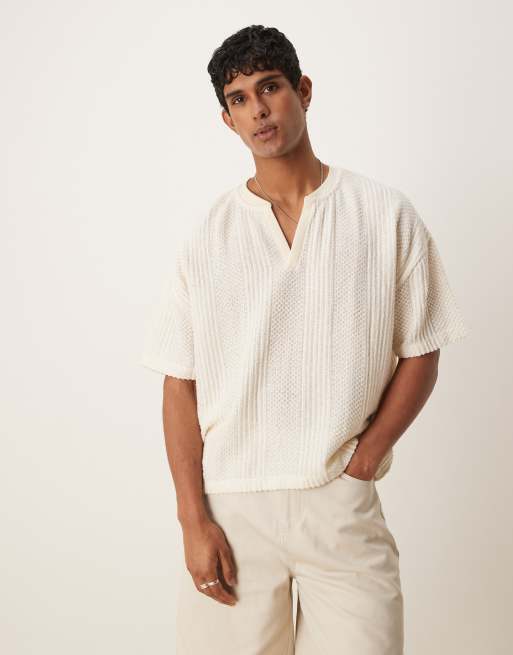 ASOS DESIGN - Cremehvid oversized T-shirt med sænkede skuldre, V-hals og tekstur i firkantet pasform