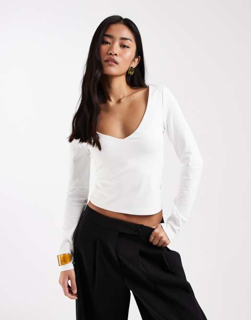 ASOS DESIGN - Cremehvid tætsiddende top med dyb V-hals i polyamid