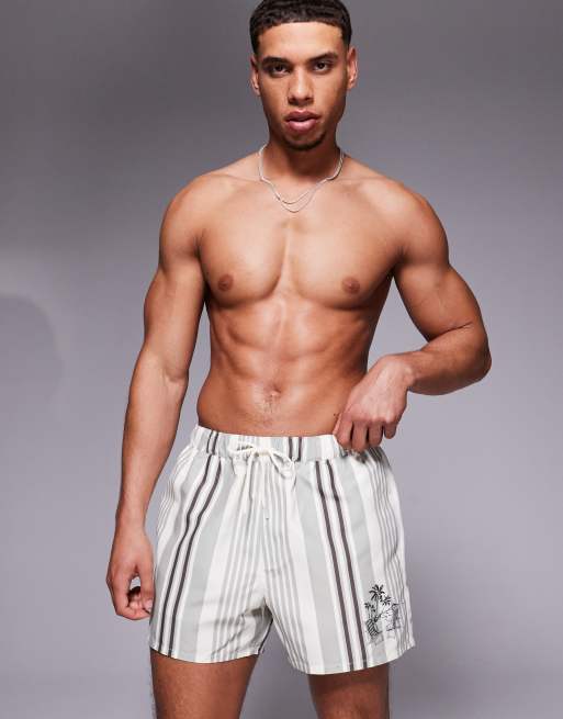 ASOS DESIGN - Cremehvide korte badeshorts med striber og print
