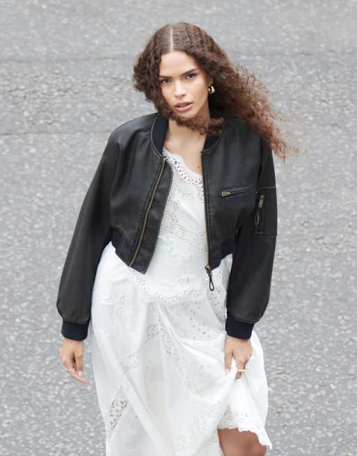 ASOS DESIGN - Cropped bomber-jakke i imiteret læder i vasket sort