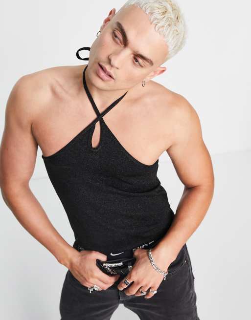 ASOS DESIGN - Cropped skinny-top med halterneck og udskæring i metallisk jersey