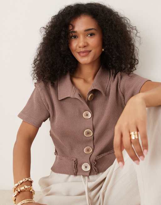 ASOS DESIGN - Cropped skjorte med knapper og vaffelstruktur i chokoladebrun vask