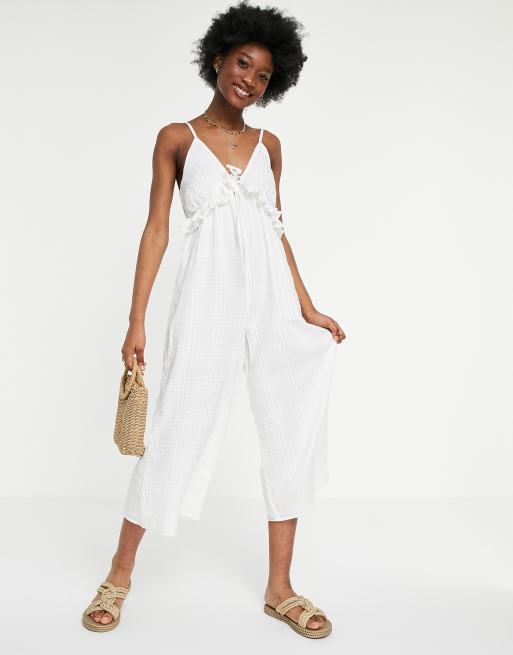 ASOS DESIGN - Culotte-jumpsuit med V-hals og flæsebånd i hvide tern