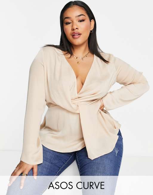 ASOS DESIGN Curve - Champagnefarvet satinbluse med snoet front og ærmer med svaj