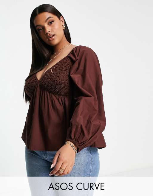 ASOS DESIGN Curve - Hæklet top med flæseærmer, peplumkant og V-hals i chokoladebrun