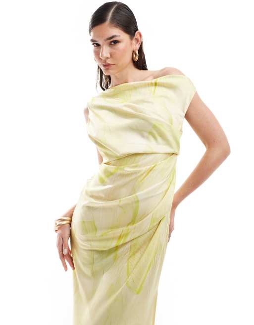 ASOS DESIGN - Draperet offshoulder-midikjole i satin med tonet palmeprint