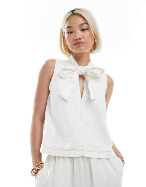 ASOS DESIGN - Ecrufarvet denimtop med A-form og bindesløjfe i halsen