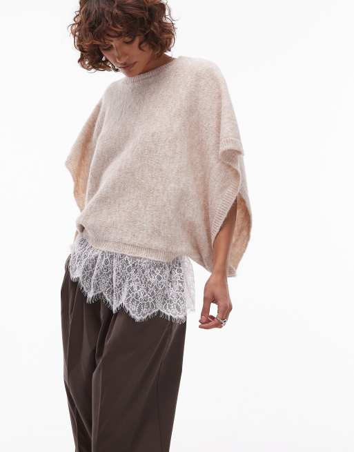 ASOS DESIGN - Ecrufarvet kappe i strik af uldblanding med blondekant
