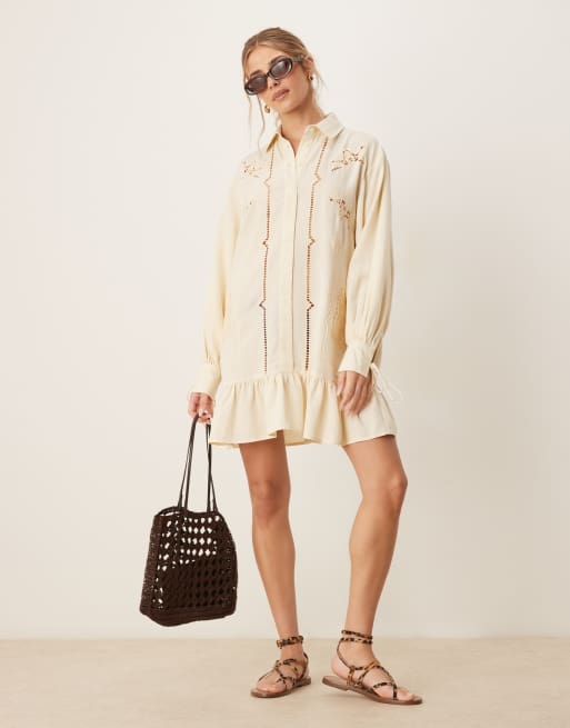 ASOS DESIGN - Ecrufarvet mini-skjortekjole med tonede syninger i broderie anglaise i twill