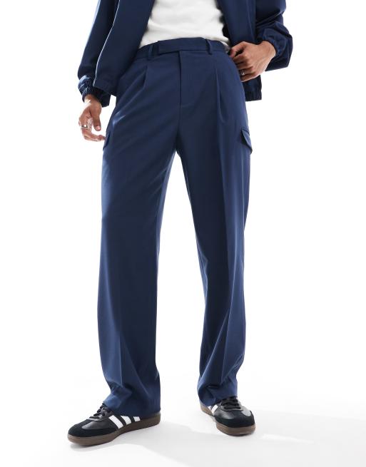 ASOS DESIGN - Elegante cargobukser med vide ben og lommedetalje i marineblå - Del af sæt