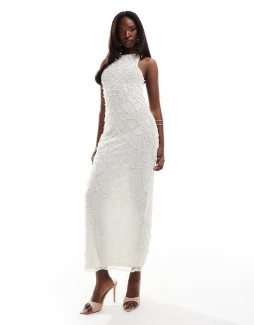 ASOS DESIGN - Elfenbensfarvet halterneck-midikjole med draperede perlestropper og perleudsmykning