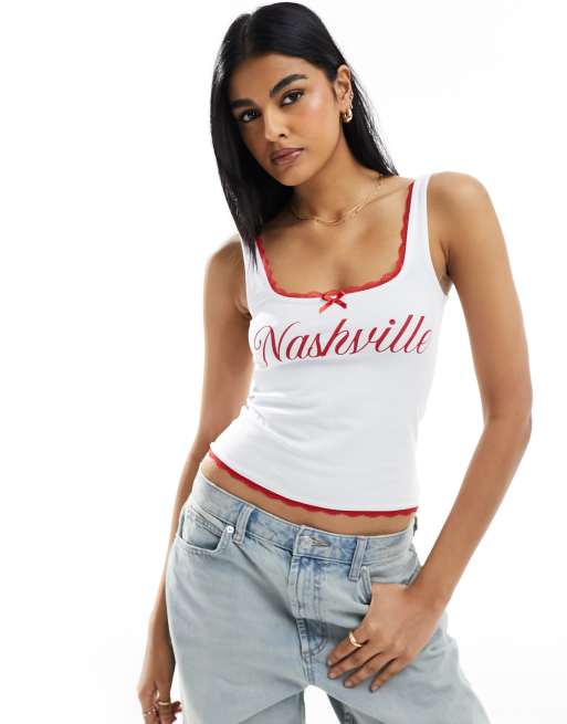 ASOS DESIGN - Elfenbenshvid trucker-vest med 'Nashville'-grafik