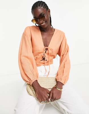 ASOS DESIGN - Ferskenfarvet top med snøre foran og store ærmer i hør