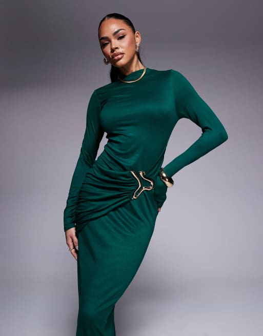 ASOS DESIGN - Flaskegrøn midikjole med høj hals, halsudskæring og guldfarvet metaldetalje