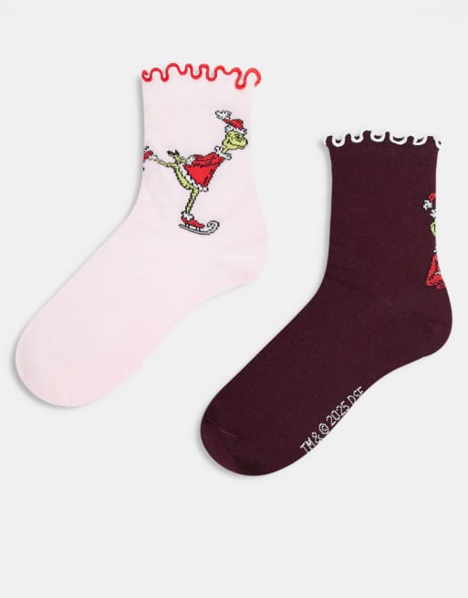ASOS DESIGN - Flerfarvede sokker med flæsetop og Grinch-motiv i julepakke med 2 par