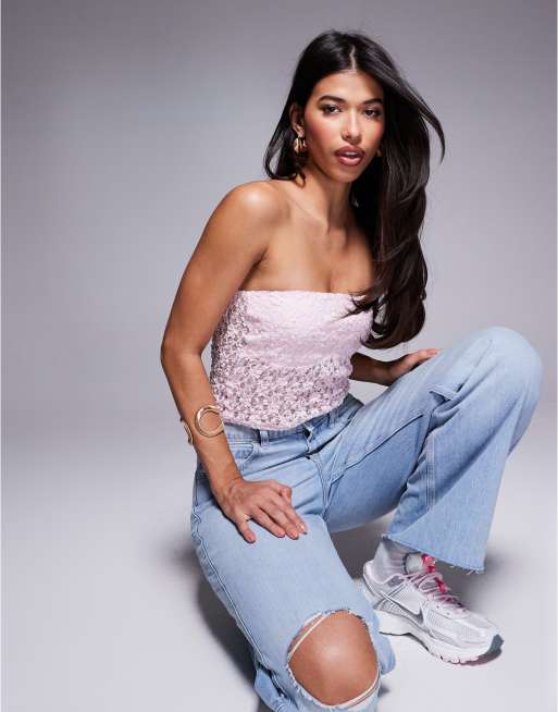 ASOS DESIGN - Formgivende og lyserød bandeau-top i blondestof