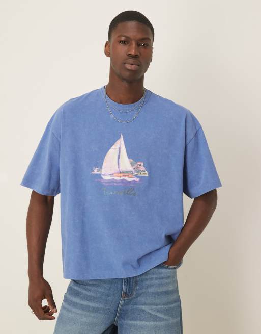 ASOS DESIGN - Forvasket blå oversized firkantet T-shirt i kraftigt stof med sommergrafik