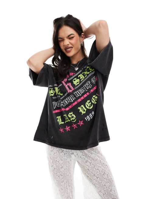 ASOS DESIGN - Forvasket koksgrå boyfriend-T-shirt med lyserødt/grønt Las Vegas-print