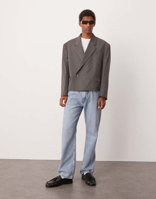 ASOS DESIGN - Grå ekstremt oversized cropped dobbeltradet blazer med nålestriber