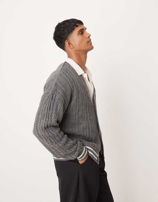 ASOS DESIGN - Grå kabelstrikket afslappet cardigan med ecrufarvede kontrastkanter i firkantet pasform