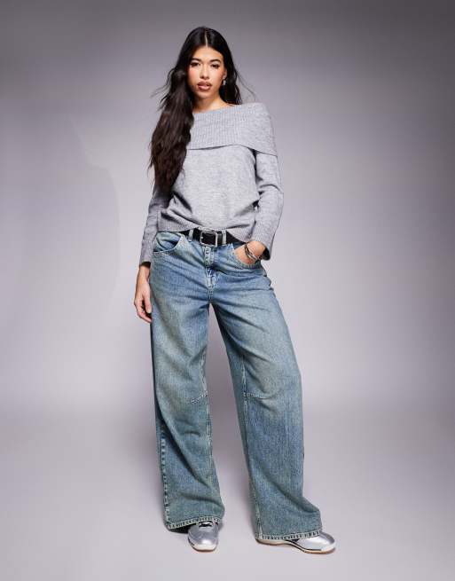 ASOS DESIGN - Grå vamset offshoulder-trøje med brede kanter