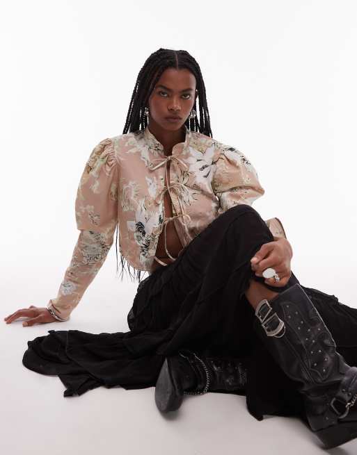 ASOS DESIGN - Gråbrun krympet jakke med bindebånd foran og blomstermønster