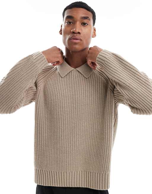 ASOS DESIGN - Gråbrun oversized trøje med krave i kraftig uldblanding i kabelstrik i firkantet pasform