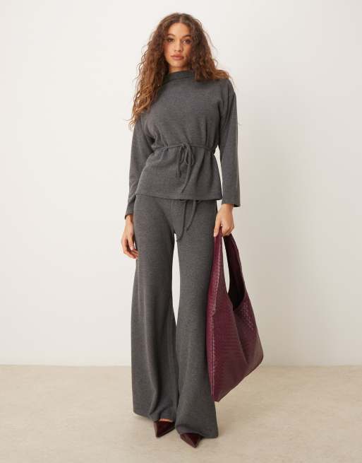 ASOS DESIGN - Gråt sæt med højhalset longline-top med bindebånd i taljen og bukser med vide ben i superblødt stof
