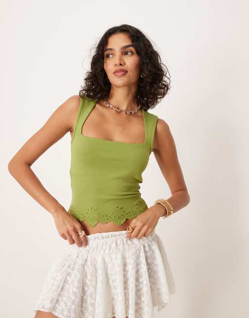 ASOS DESIGN - Grøn cami-top med firkantet hals og broderet hulmønster forneden