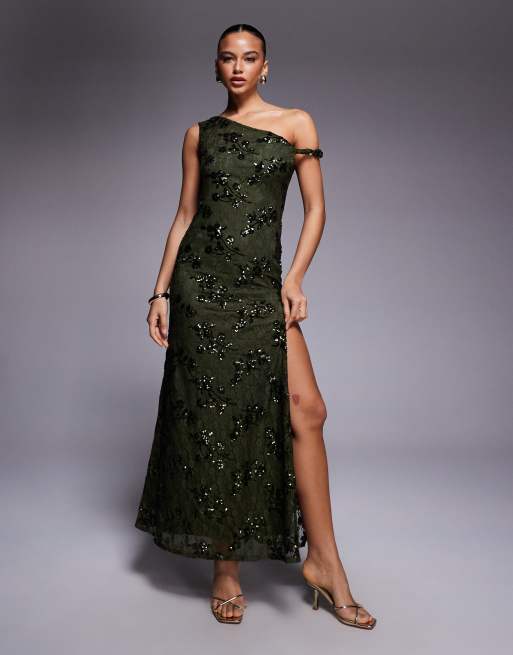 ASOS DESIGN - Grøn offshoulder-maxikjole med snoet strop samt snøredetalje på ryggen og pailletter i blondestof