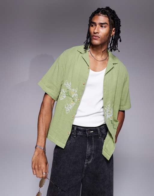 ASOS DESIGN - Grøn skjorte med firkantet pasform, reverskrave og blomsterbroderinger
