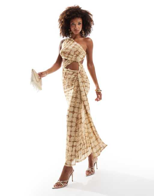 ASOS DESIGN - Gul asymmetrisk oneshoulder-midikjole med lange bindebånd og tern i mesh