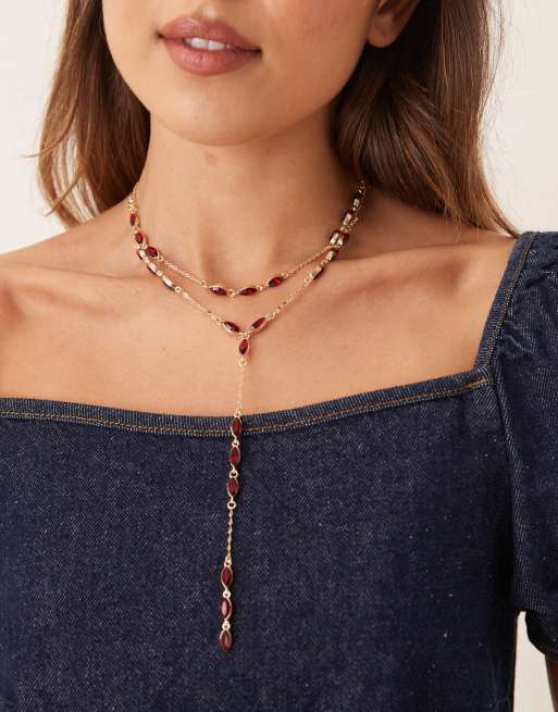 ASOS DESIGN - Guldfarvet lagdelt lariat-halskæde med udsmykning med imiterede smykkesten