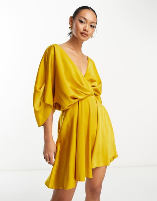 ASOS DESIGN - Guldfarvet minikjole med flagermusærmer og dyb udskæring