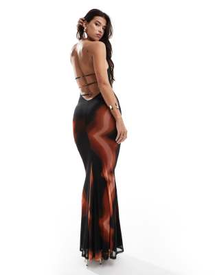 ASOS DESIGN - Halterneck-maxikjole i mesh med åben ryg og stort abstrakt print i orange og sort