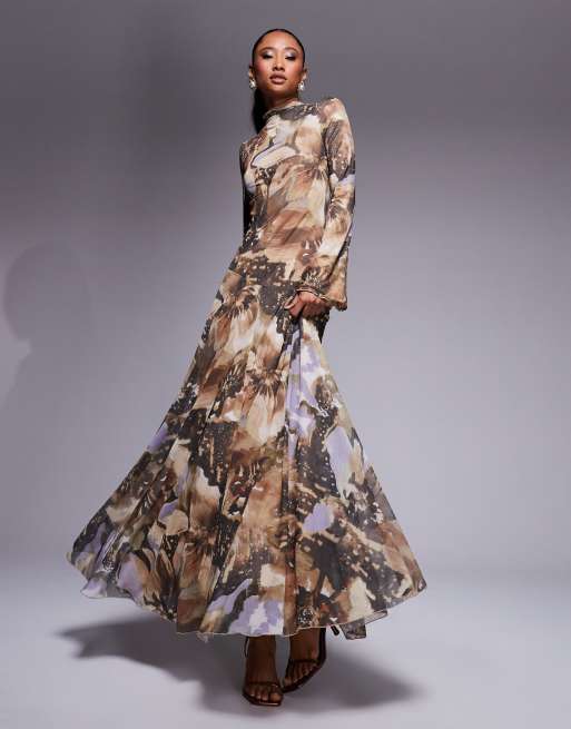 ASOS DESIGN - Højhalset maxikjole med lange ærmer, A-form og stort blomstermønster i mesh