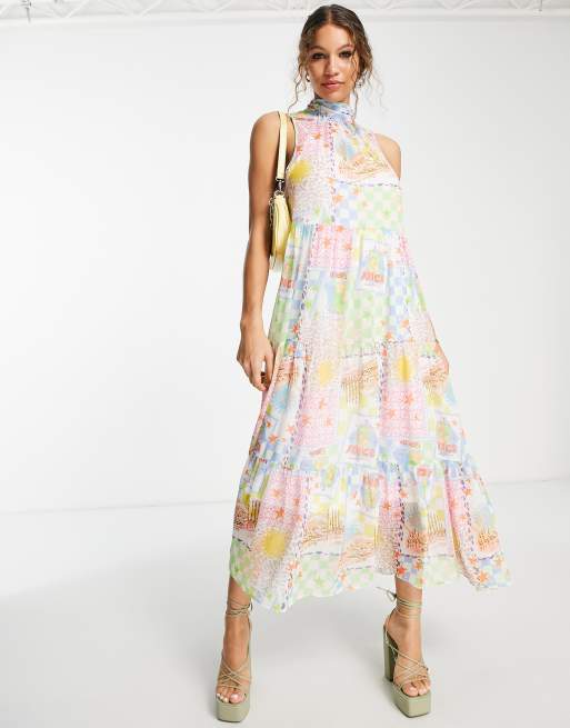 ASOS DESIGN - Højhalset niveauinddelt maxikjole i lyst postkort-print