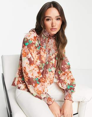 ASOS DESIGN - Højhalset rynket langærmet bluse med flæsedetaljer i pink blomstermønster