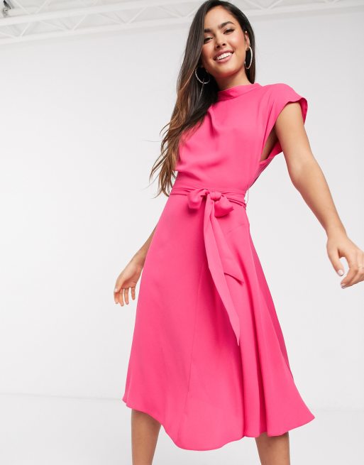 ASOS DESIGN - højhalset skatermidikjole i magenta med ærmer ud i ét