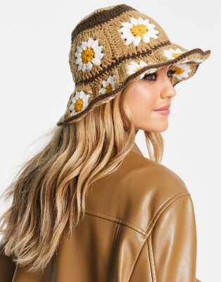 ASOS DESIGN - Hæklet brun bøllehat med marguerit-detalje