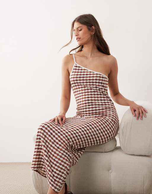 ASOS DESIGN - Hæklet oneshoulder-maxikjole med brune og hvide tern i jersey
