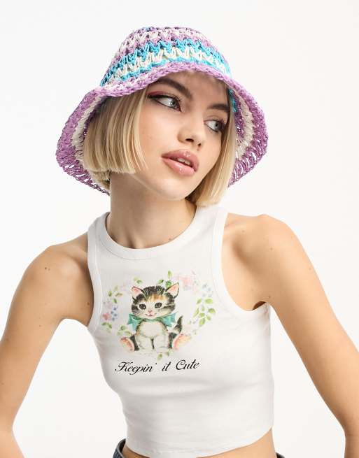 ASOS DESIGN - Hæklet strå-bøllehat i lilla med striber