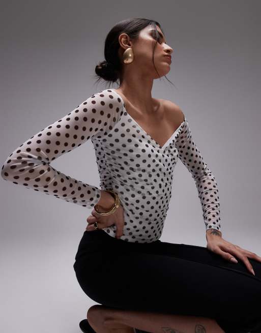 ASOS DESIGN - Hvid bardot-top med slå-om-snit og polkaprikker i mesh